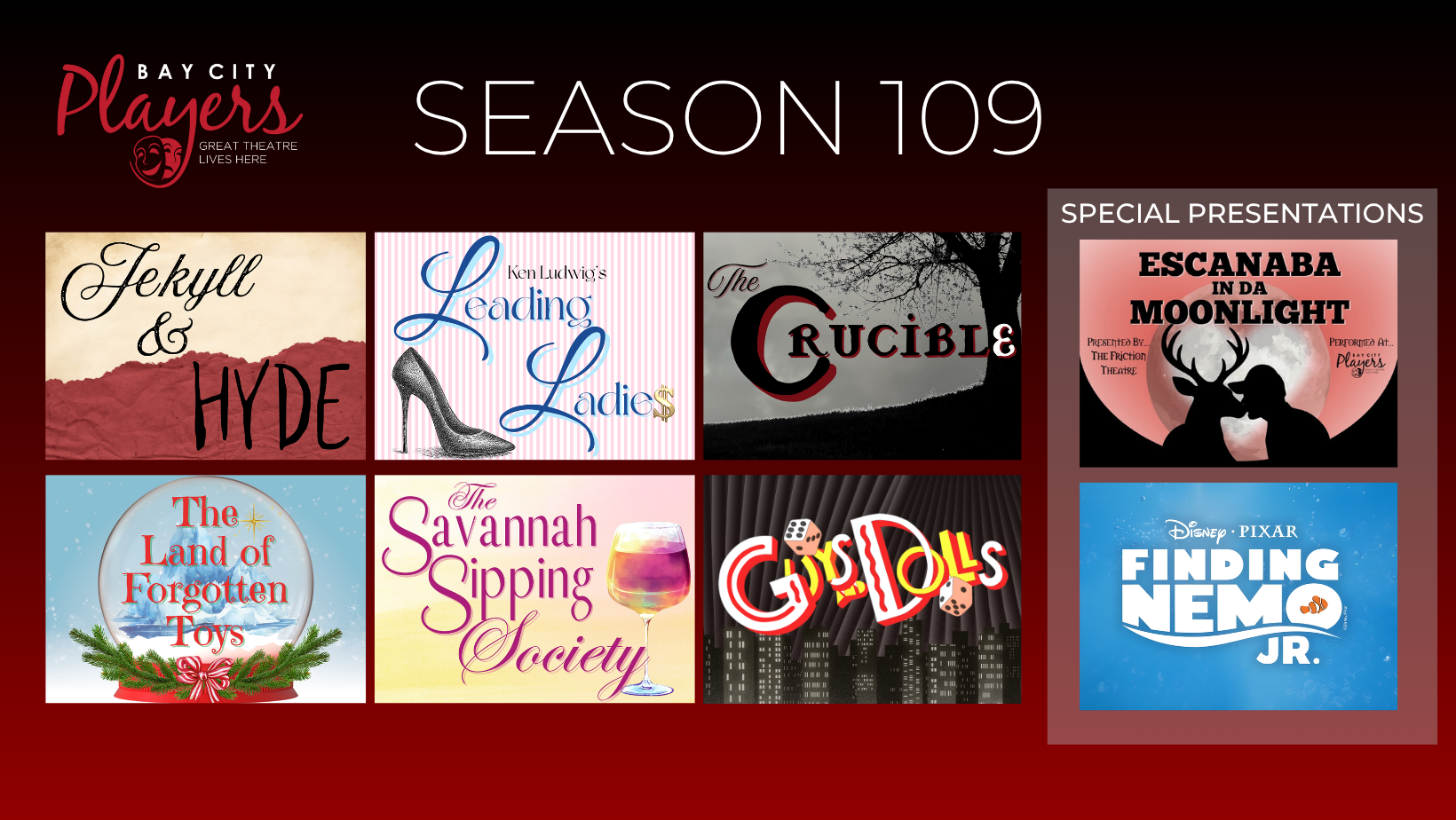 Don’t miss out on this amazing opportunity! Reserve your seats now by purchasing an early bird Flex Pass by June 15, and receive the best price and seat choice. Single tickets go on sale May 27. Early Birds save $4-8 per single ticket! New this year, every Flex Pass holder will receive an additional $2 off any single ticket purchased outside of their Flex Pass! Each Flex Pass gives you 5 tickets to use toward ANY Season 109 show in any combination: Jekyll & Hyde: July 24-26, 31-Aug 2, 2026 Leading Ladies: September 13, 18-20, 2026 The Crucible: October 16-18, 23-25, 2026 The Land of Forgotten Toys: December 4-6, 10-13, 2026 The Savannah Sipping Society: January 15-17, 2027 *The Friction Theatre’s Escanaba in Da Moonlight: January 29-31, February 5-7, 2027 *Encore Youtheatre’s Finding Nemo Jr.: March 12-13, 19-21, 2027 Guys and Dolls: April 23-25, 30-May 2, 7-9, 2027 |